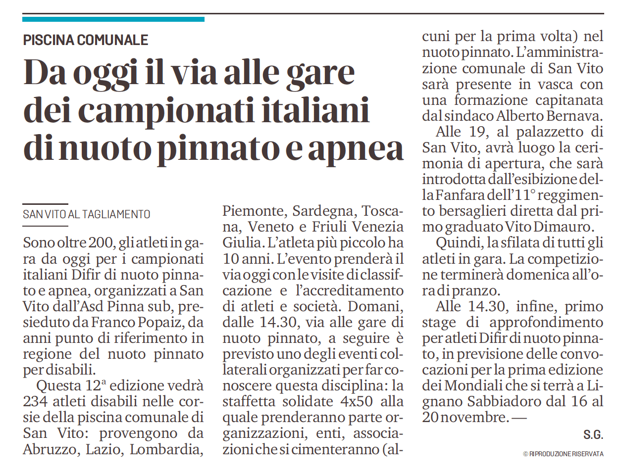 "Campionato Italiano Paralimpico di NUOTO PINNATO VELOCITA’ -S. Vito al Tagliamento -PN-"